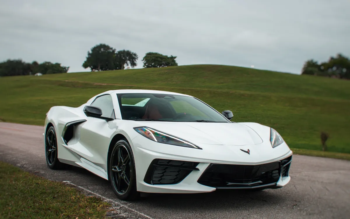 In a city that loves an entrance, the white C8 is pure spotlight—mid-engine stance, crisp handling, and clean, modern lines from Ocean Drive to Brickell Key.