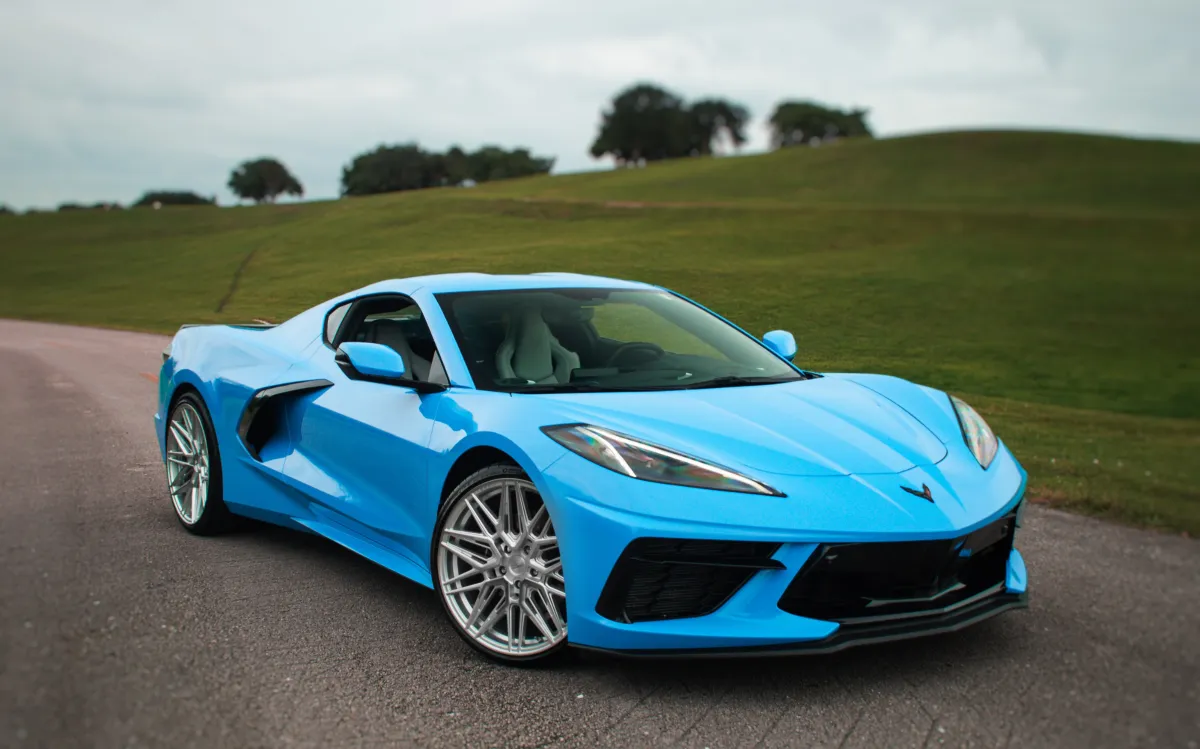 In a city that loves an entrance, the blue C8 steals the scene—mid-engine stance, crisp handling, and sunset-to-sunrise style from Ocean Drive to Brickell Key.